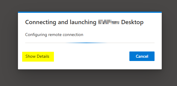 The application will begin to launch in a new tab. You will see a pop-up dialog box. You can decide to wait until the desktop appears, or you can select the Show Details tab to view the login process.