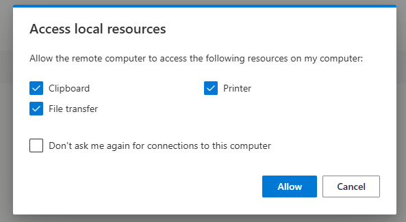 - You will be prompted for consent to allow the remote computer to access resources on your computer. Select the options that apply to you.